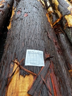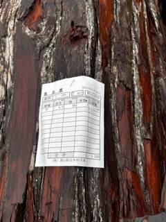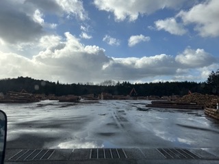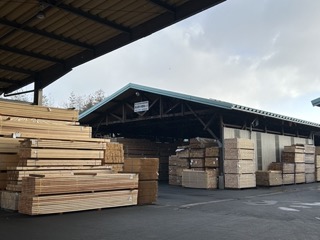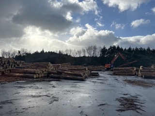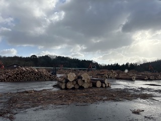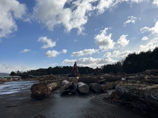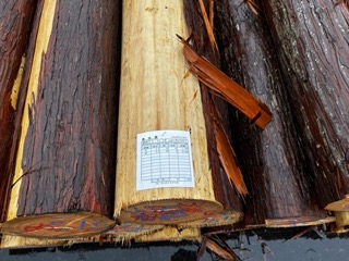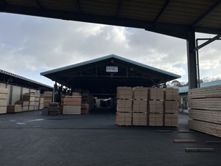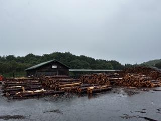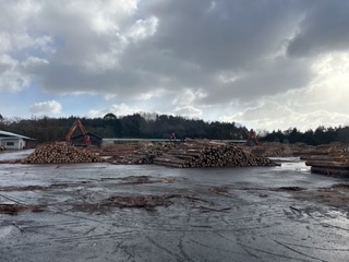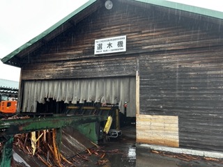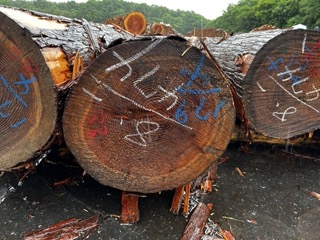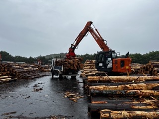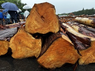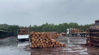 積み上げられた原木を、怪手を介して入札された原木を原木トラックの上に置き、購入者に届ける。(將堆置的原木,經由怪手,放置在送原木的卡車,運送至買家地點)