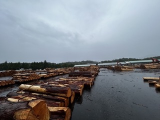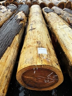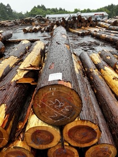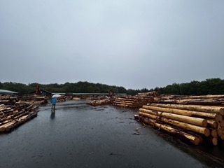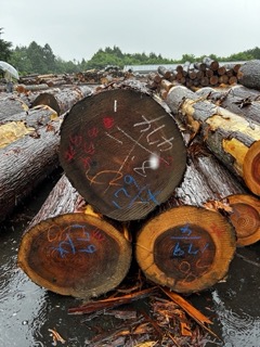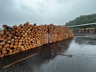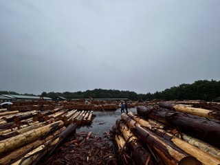 原木の樹種と長さ及び樹径を、分類する。整然と積み上げられた丸太。(原木依照種類、樹徑、長度,進行分類,屏整齊堆放於木材市場)